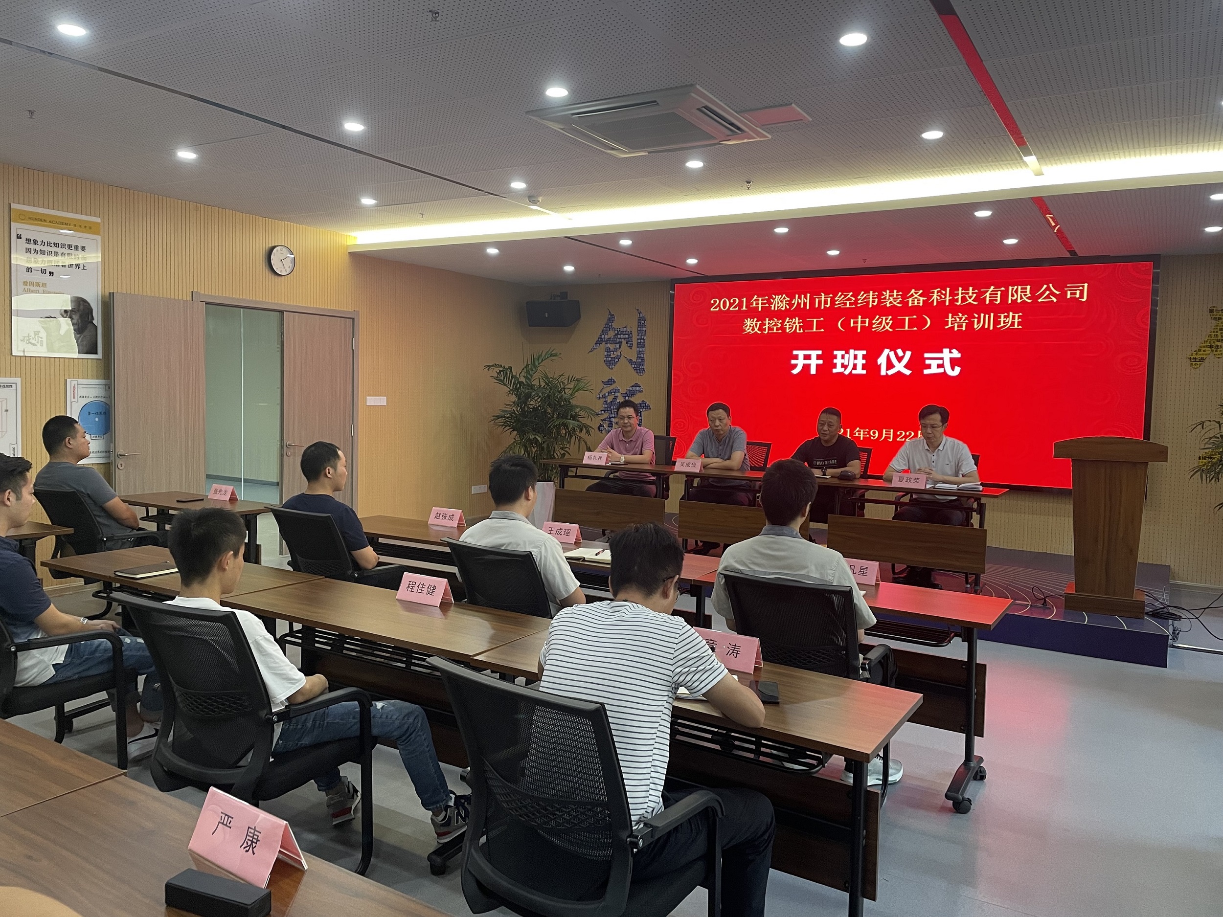 2021年9月22日,滁州市經(jīng)緯裝備科技有限公司數(shù)控銑工(中級(jí)工)培訓(xùn)班正式開班,開班儀式由公司職業(yè)技能等級(jí)認(rèn)定工作委員會(huì)副主任夏政榮同志主持,來安縣人社局職鑒中心主任王躍進(jìn)同志代表縣人社局做了指導(dǎo)發(fā)言,公司職業(yè)技能等級(jí)認(rèn)定工作委員會(huì)主任楊禮兵同志做了相關(guān)要求發(fā)言,公司董事長(zhǎng)吳成儉同志做了強(qiáng)調(diào)發(fā)言。